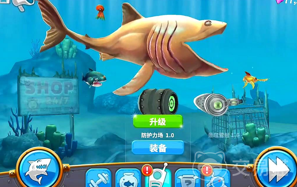 在这款游戏中想要解锁鲨鱼一共有两个办法,首先最简单的是直接购买,你需要先在游戏中购买一定数量的钻石,然后打开商店选中你想要解锁的那一款鲨鱼,点击购买即可解锁。当然如果有不想充值的玩家也是有其他办法的,在游戏中打败敌人可获得积分,只要你的积分足够达到系统的条件,就可以解锁相应的鲨鱼,然后在游戏中直接用金币购买就可以了。