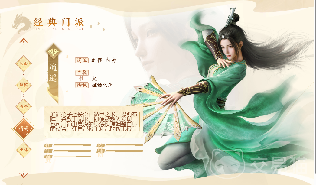 逍遥派擅长使用扇法和法术。逍遥派的强身技能叫做“逍遥游”,可以增加自己的攻击力和暴击率,同时提高自己的冰抗和毒抗。逍遥游可以让逍遥派在战斗中更加犀利,并且对付冰毒系法术有一定的抵抗能力。