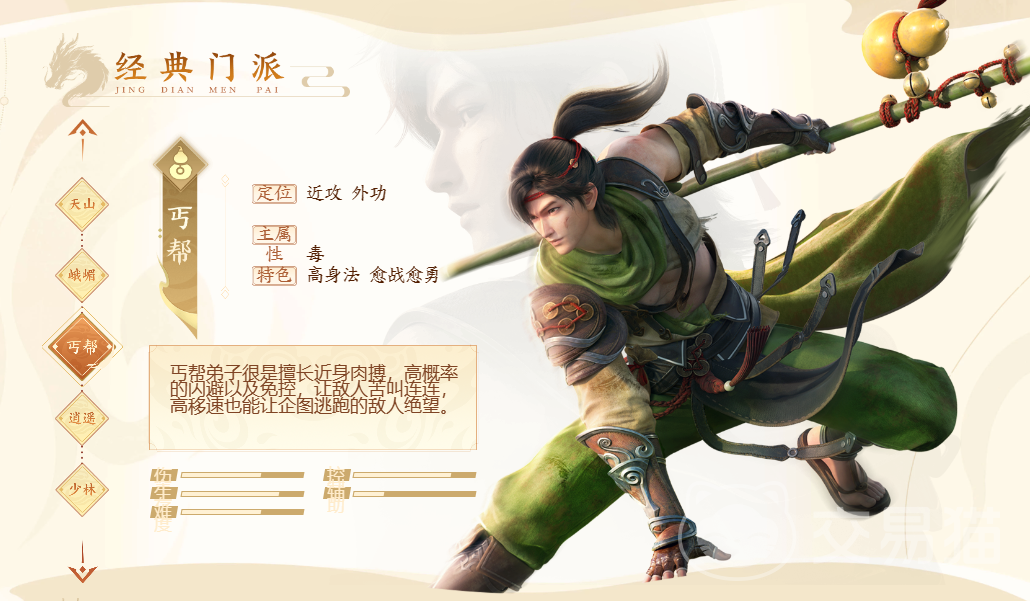丐帮擅长使用棍法和拳脚。丐帮的强身技能叫做“降龙十八掌”,可以增加自己的攻击力和闪避率,同时提高自己的火抗和雷抗。降龙十八掌可以让丐帮在战斗中更加灵活,并且对付火雷系法术有一定的抵抗能力。