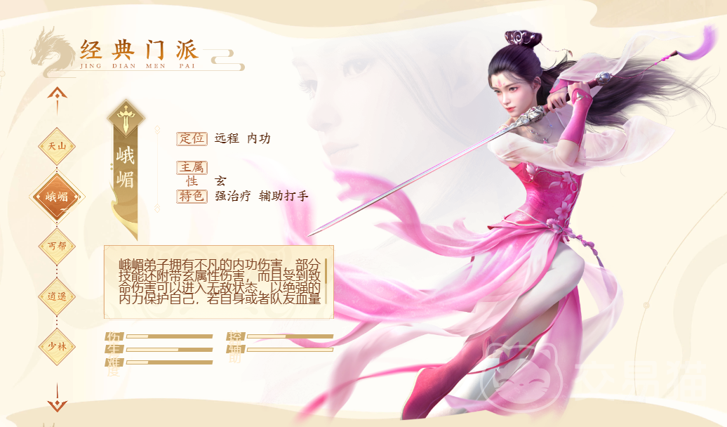 而峨嵋派始终混合输出型职业,已远程为主。峨嵋派的强身技能叫做“峨嵋心法”,可以增加自己的攻击力和防御力,同时提高自己的雷抗和毒抗。峨嵋心法可以让峨嵋派在战斗中更加坚韧,并且对付雷毒系法术有一定的抵抗能力。