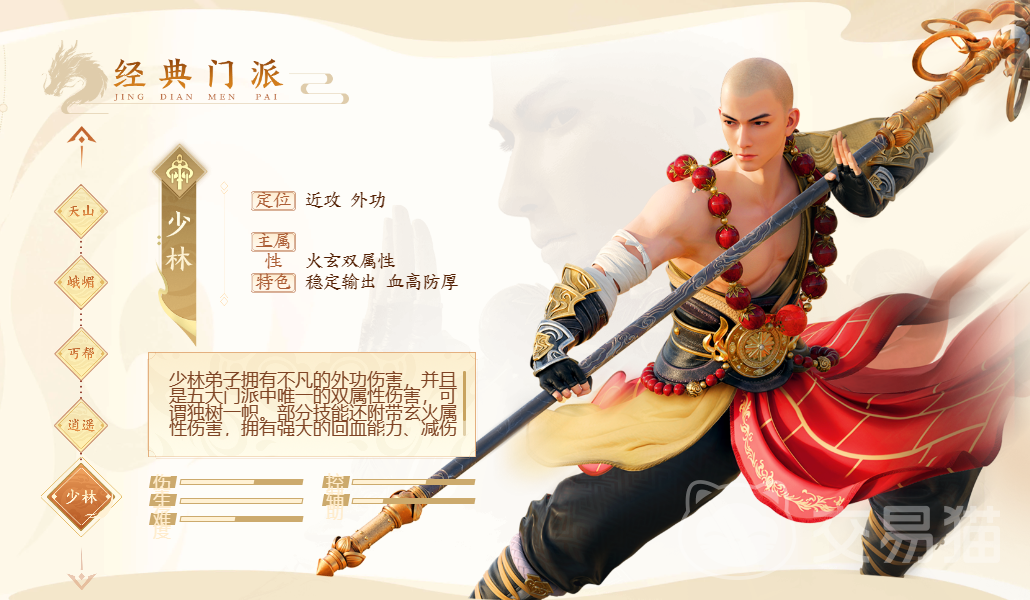 少林派则也属于贴脸输出方式,且十分擅长使用棍法。内功方面也十分出色。此门派的强身技能叫做“金刚不坏体”,可以增加自己的防御力和HP回复,同时提高自己的所有抗性!金刚不坏体可以让少林派在战斗中更加坚固,并且对付各种法术有一定的抵抗能力。