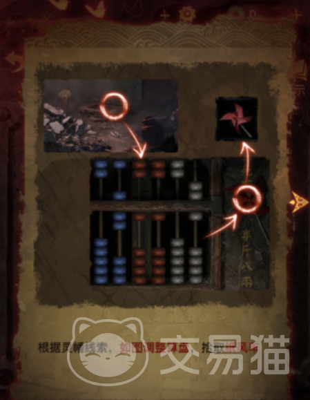 在第四章开始时,你会看到一个破旧的房间,左下角有一堆乱石。点击乱石,你会得到一个木偶头、一些石块和一块木板。在乱石旁边有一个火盆,点击火盆,你会得到一些纸灰。在房间的右上角有一个洞口,洞口里有一些灵幡。这些灵幡是一个算盘机关的线索。点击地上的算盘,你需要根据灵幡的数量来调整算盘的珠子。算盘是16进制的,每满5个珠子就要进位,每满16个珠子就要进位。