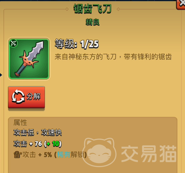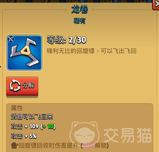 除此之外,在游戏中就是一个相当锋刃的回旋标,这个回旋片攻击之后会自动飞回,相相弓箭来说,攻击能力会更强一些,而且回旋镖可以对人物造成穿透伤害,如果回旋镖回旋回来的话,还会对敌人造成二次损伤,新手玩家也非常适合使用这个武器,相比较游戏中最基础的弓箭来说,攻击范围会更大一些。