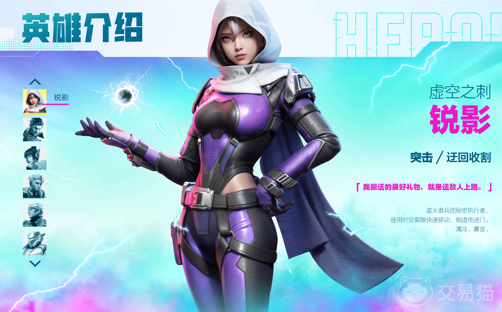 鋭影:他的定位是一个远程刺杀和狙击型的英雄,擅长用超远距离的位置感知和虫洞来快速转移阵地或是接近对手。她的战术技能是“高能感知”,这个技能是锐影最具特色的技能,在距离敌方距离过近的时候会收到一个神秘提示,这让她具备了极强的反侦察能力。他的一技能是“虚空行走”,可以在使用之后后,获得一段时间的隐身效果,并增加自己的移动速度和攻击力。他的绝招是“部署虫洞”,可以向指定方向释放虫洞,再次释放则激活传送门,保证了锐影的灵活度和生存能力。锐影适合在远程追杀敌人,利用虚空行走和虫洞进行灵活的移动和输出,完成连续的击杀。