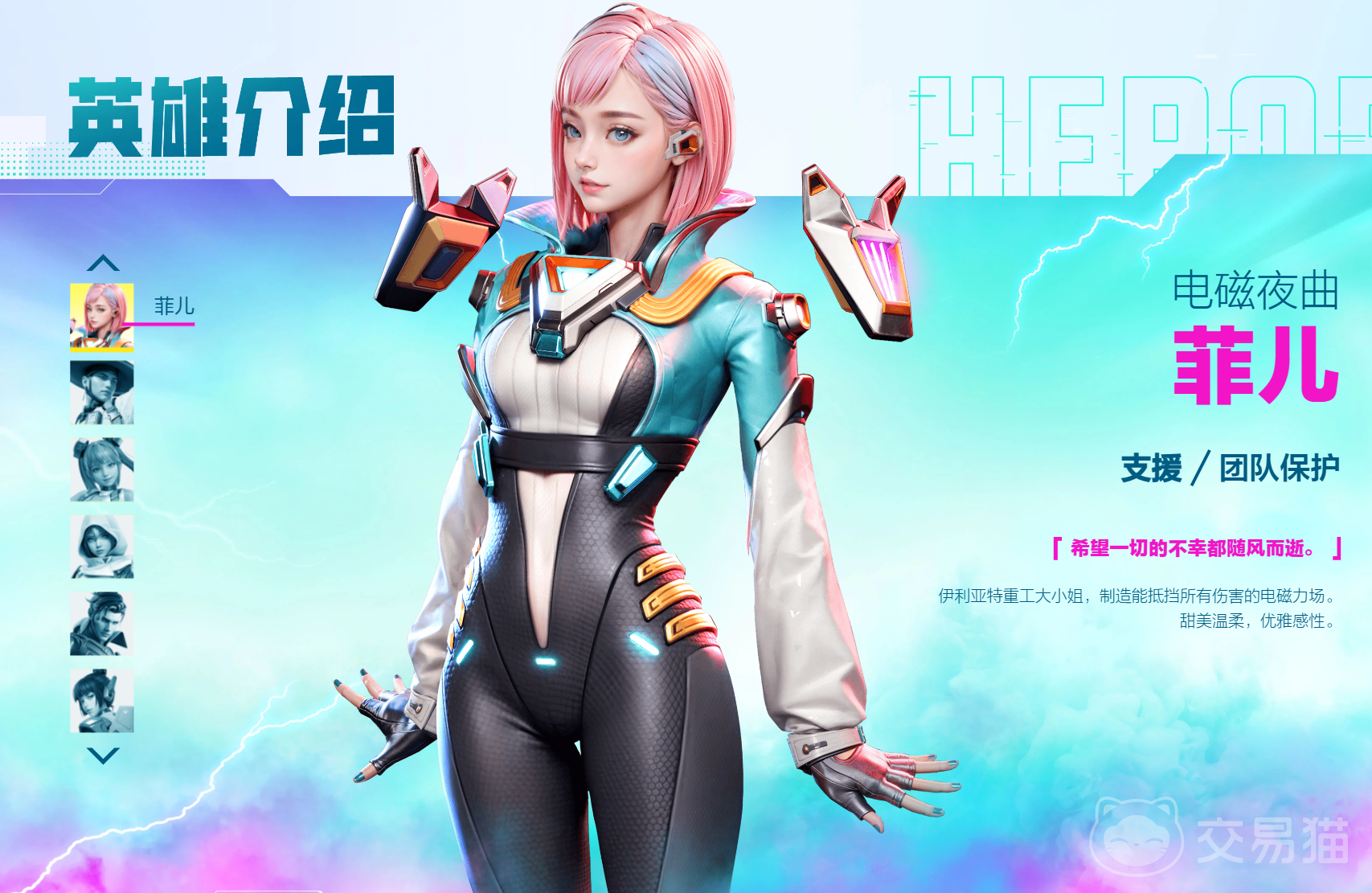 菲儿:重装突击型女战士,擅长用可恢复的护甲及极强的控制能力对战场进行分割。她的战术技能是“反领域立场”,可以向指定位置投掷反领域装置,持续期间无法输出但是持续无敌效果,是被集火、骗技能的神技。她的被动技能是“护甲充能”,可以在自己或队友受到伤害时,进行缓慢地护甲自动回复。她的绝招是“绝对防御”,可以在指定区域召唤出一个无敌领域,对区域内的敌人及队友套上无敌buff。它能让敌我双方都进入无敌状态,在以少打多的被集火阶段非常好用。