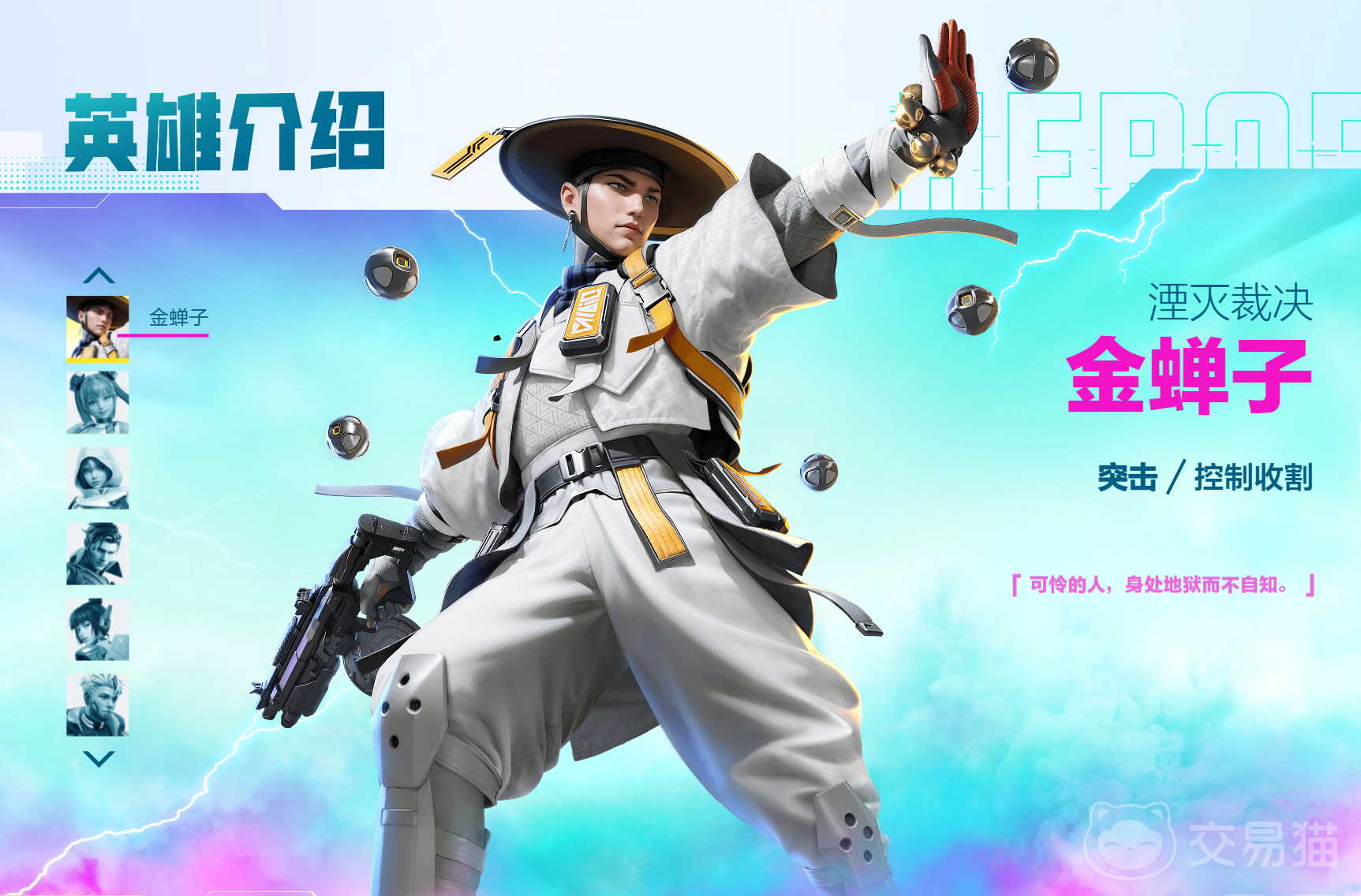 金蝉子:他是一个身穿科技型短打装扮,头戴圆形斗笠的神秘人物。定位是一个远程输出和控制型的英雄,擅长利用量子力量对敌人造成持续伤害和限制。他的战术技能是“印记”,可以向前方发射追踪器,对命中的敌人造成伤害,并使其短暂暴露视野。他的一技能是丢出一颗类似手雷的减速立场,不仅能能减速敌人,更能显示敌人运动轨迹。他的绝招是“裁决裂缝”,可以在指定区域打开一个领域,将敌人吸禁用技能,并对其造成大量伤害。金蟬子适合在远程支援队友,利用飞镖和裂缝控制敌人的位置和行动,同时利用天眼被动提高自己的输出能力。