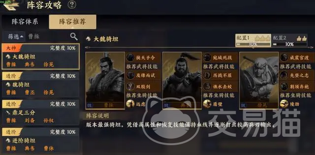 然后是第二套阵容骑坦流,该阵容是由曹操、典韦、许诸组成的,除此之外还需要带上断流水源、以防为攻等技能,当这些技能搭配完成后该阵容也就成型了,在构成之后大家就能将这套阵容放到实战中了。在实战中,该阵容虽然是一套骑兵流的阵容,但是区别于其他的骑兵,这套骑兵流阵容是属于防守反击的打法,所以在兵力的消耗上,是要远低于传统冲锋流的骑兵的。除了这一点之外,其他和骑兵基本一样。可以说是完全补足了骑兵唯一的缺点,让骑兵变的无懈可击,因此该阵容顺利的成为了版本t0阵容。