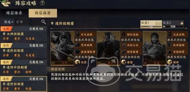 后者第六套阵容则是主打控制流的阵容组合,该阵容是由吕布、董卓、徐晃组成的,另外还需要搭配上他们三人的专属技能,当这套阵容完全组建成功之后将他们放到实战中就能看到该阵容恐怖的控制能力了。在控制方面,该阵容中的几位角色都有控制率提升的特性,再搭配上面的控制技能,可以说是能不间断控制敌人的。另外这几位角色的输出也是很高的,这种高输出搭配上自身的高控制,是能做到在控制期间内稳定击杀敌人的效果的,这个效果目前来说只有该阵容能做到。