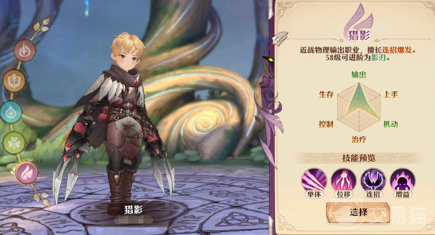 猎影:这一职业定位偏向刺客,所以技能伤害普遍较高,并且机动性也十分不错,其一技能是“爪击”,基础伤害低,但物攻加成可观,并且CD和蓝耗也很低,能在实战中频繁使用。