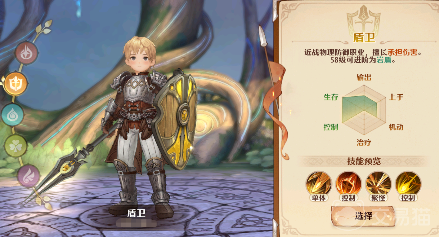 盾卫:它是游戏内的防御职业,承伤能力一流。一技能是“惩击”,CD仅有五秒,可以对单体敌人造成三次戳刺,技能的初始物攻加成有250%,但基础加成不高,不过使用后可以给自身添加格挡。