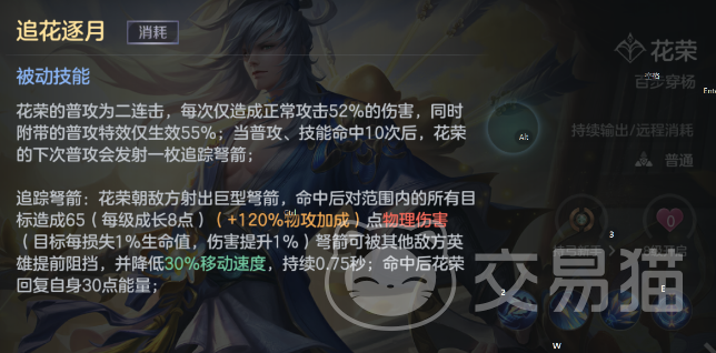 花荣的被动技能可以让普通攻击效果变成二连击,这个被动效果是可以进行叠加强化的,昂自身的普攻或者技能度敌人造成10次伤害后,那么这个效果还会继续发生转变,释放出一个可以追踪的弩箭,对前方的敌人造成伤害减速效果的同时还会回复一点能量!