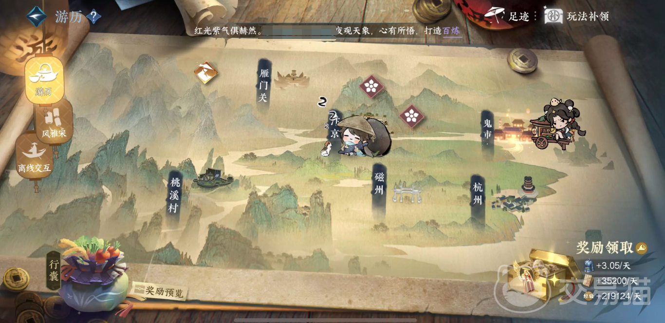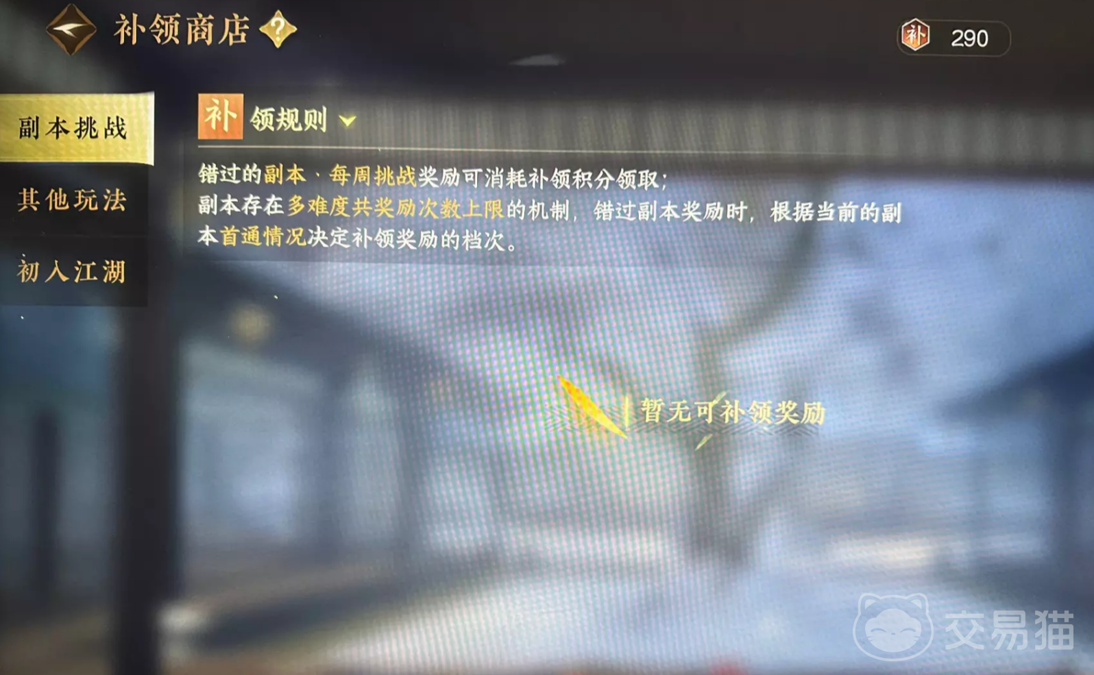 补领商店的位置很容易找到,只要打开游历界面,就可以在右上角看到一个补领商店的图标,点击它就可以进入补领商店。补领商店中有3+1种补领玩法,分别对应周挑战副本、活力、风云令以及单独的活动游历四种玩法。
