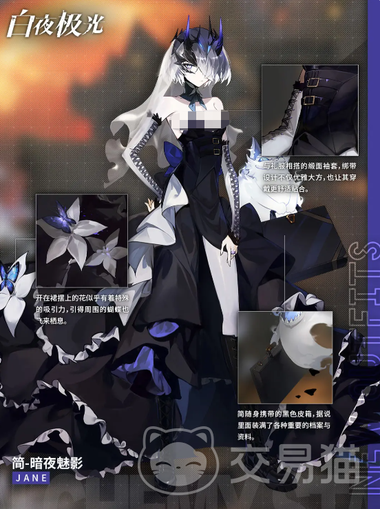 暗夜魅影是一个以黑色为主的皮肤,在服饰制作上看起来很华丽,造型像是西式的抹胸晚礼服,但是下摆有着夸张的黑色花边,长度直接拖地,一个长袖的白色色长袖缎面袖套跟裙子的颜色搭配,因为简的头发是白色长发,所以头上带着一个黑色类似皇冠的发饰看起来就非常的明显。