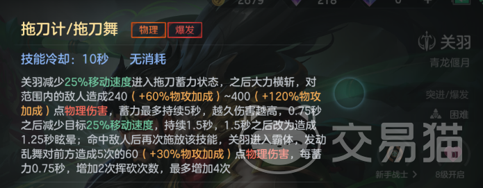 关于的被动技能可以对敌人造成三次攻击的时候回复少量的血量,而且自身的技能都与使用的武器有很大的关系,在战斗中,玩家们可以优先开启【拖刀计】,这个时候关羽的移动速度会降低,然后进入蓄力状态,在结束后会对伏击个的敌人造成高额的物理伤害,这个伤害就取决于玩家们蓄力的时间了!