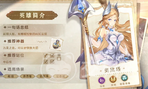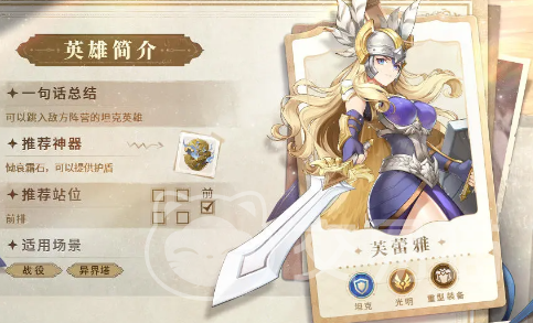 芙蕾雅则是队伍中的前排,做为前排的她防御面板肯定是非常高的,除了防御面板高之外,她的技能配置也很不错的,技能方面她自带一个治疗技能和一个aoe伤害技能,这两个技能让她的综合战力再次提高了一个档次。除此之外,她还可以带上一个神器,这个神器可以再次强化她的生存能力,有了神器之后她就是前期最强的前排。