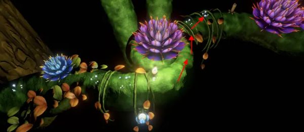 接着再来到第三关的时候可以看到很多紫色的花,这里是比较难通关的,必须要等到屏幕暗下来的时候,这个紫色的话会慢慢变小,大家一定要在花变小的时候再从它的旁边空地过去,动作一定要慢,不要将花惊醒了,而且在整个过程中千万不是发出任何声音哦,过去后就可以看到这个章节的第二根蜡烛啦。
