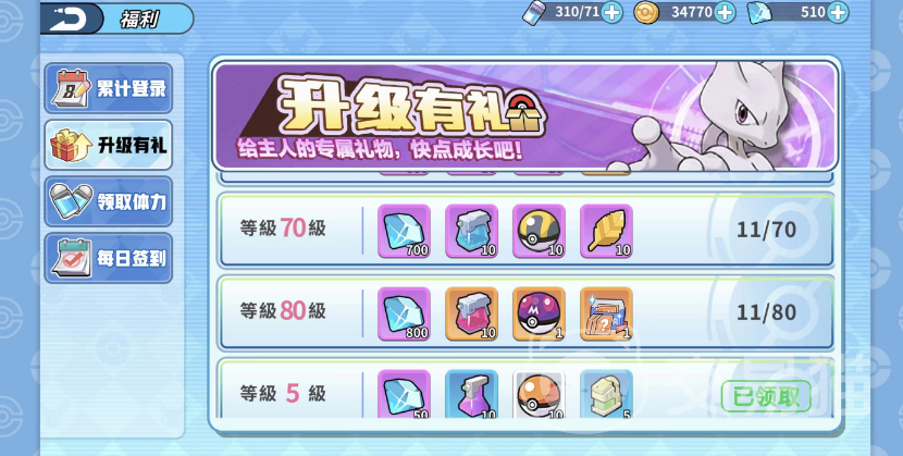 除了签到领取大师球以外,还有另一种拿大师球的方式,那就是通过升级领取,游戏内的升级过程每隔一阶段都可以在福利中的升级有礼领取部分道具奖励,其中80级的时候会直接送你一个大师球,所以各位小伙伴需要努力去提升等级。