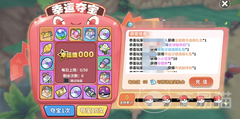除了上述两种免费途径,还有一种付费途径可以获取,那就是通过付费的幸运夺宝去获取,你每充值六十个钻石就能获取一次夺宝机会,夺宝次数越多,幸运值则越高,相应的能够获取的物品就越好,大师球也在它的夺宝奖池中,并且品质属于最高的那一档,所以大家有条件的话也可以通过充值夺宝的方式来获取它。