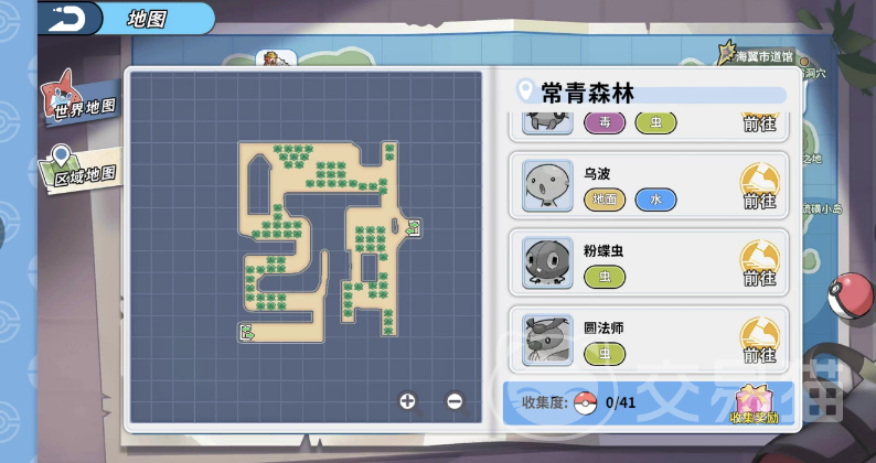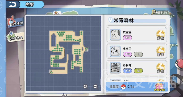 常青森林其实就在星辉镇的右下方,要前往那里可以通过世界地图来进行快速导航,通过点击地图上的常青森林你还可以看见它的具体地形以及其中的精灵分布情况,这里面的精灵种类多达四十一种,包含了妖精系,一般系,飞行系和虫系等多类存在。