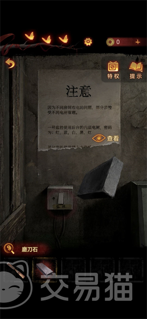 首先,如果各位想要获取本关的解谜线索,那么就需要通过视频监控来获取,而想要调取视频监控进行查看,最先要做的就是打开视频监控的开关。由于年久失修,想要打开视频监控的开关,还需要大家使用一些暴力手段:在物品栏找到磨刀石并进行使用,然后对着监控开关进行互动,这样就可以用物理方法打开视频监控的开关了,而接下来,想要破译时钟解谜的关键,就需要各位从这个小小的视频监控屏幕上获取。