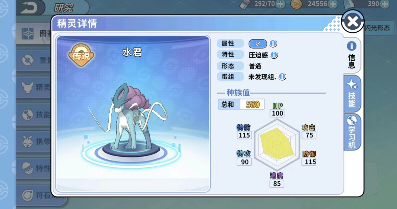 特性方面,水君有两种特性可供选择,第一个是能够减少敌人技能使用上限的压迫感,这一特性其实非常适合它,因为水君是一个偏向防守的精灵,因此配合一些回复道具能够直接拖延到压迫感的作用完全发挥,当对手的技能全部用完,那么水君就可以开始轻松反攻了。