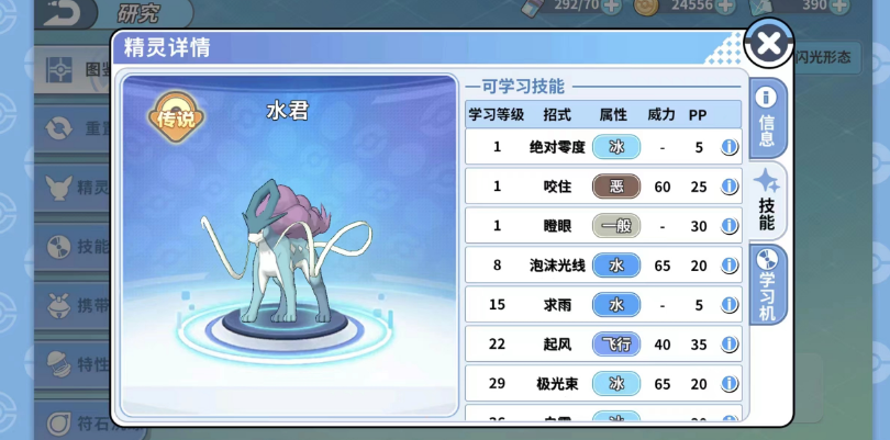 最后再来看看它的技能,技能分为前期和后期两个阶段,一到三十六级的这些技能都可以看做水君的前期技能,其中一级就能学会的三个技能除了瞪眼稍显鸡肋以外,其他的像是绝对零度和咬住都是非常强力的存在,前者虽然威力只有5,但只要命中就能够实现一击秒杀,而后者则不仅有着60的不俗威力,而且还有几率让敌人陷入畏缩,可谓是同时兼顾了输出与控制!