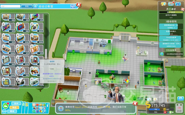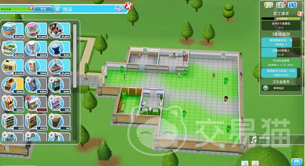除了前面的价格硬指标之外,本关的三星条件中比较棘手的事让医院的吸引力提升到65%,吸引力是以绿色区域覆盖在医院中的形式出现,大家可以在医院的墙上张贴金星奖,以及在室内空地放上留声机,二者相配合很快就可以将医院的吸引力提升上来,同时金星奖还可以增加医院的等级,可谓一举两得。