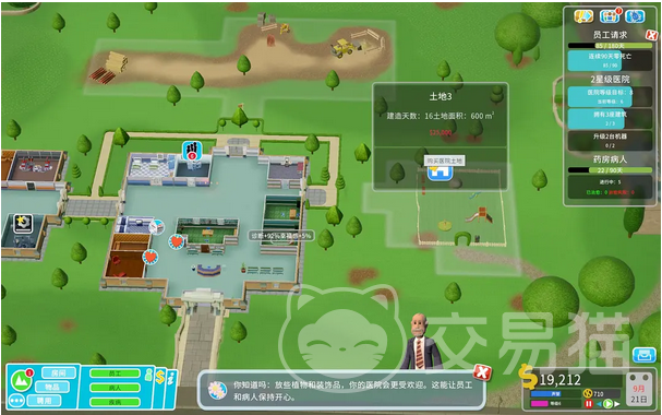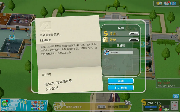 接下来说说本关达成三星的几个主要目标:首先将医院的等级提升到10级,这一点是最容易达成的,只要各位扩大医院的规模,多建造科室,以及多雇佣医护人员,很快就可以将医院的等级提升到10级,不过考虑到效率问题,这里还是建议大家尽量将科室之间留下一条足够宽敞的走廊,同时在科室中布置尽量多的床位,这样能让病人排队治病的效率提升,尽快完成治愈20人的目标。