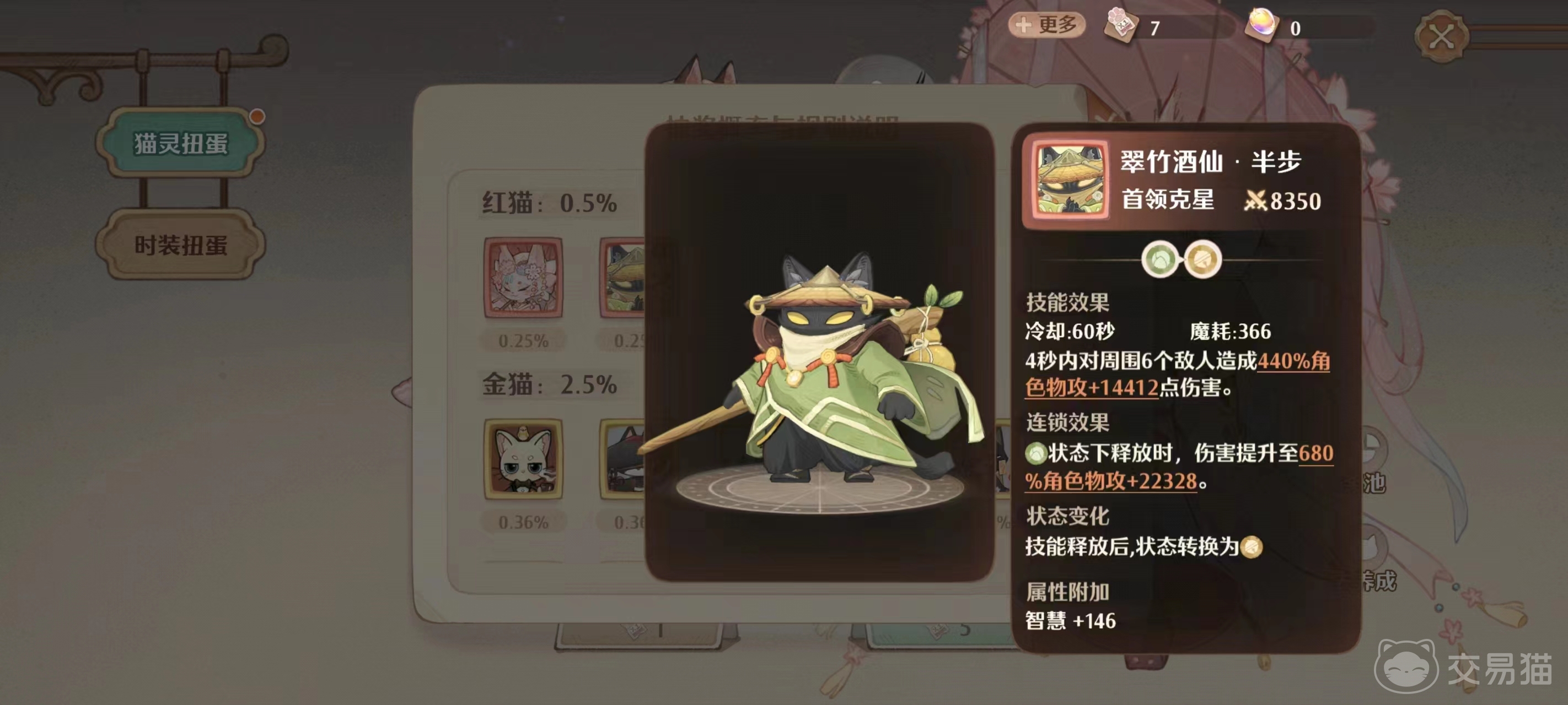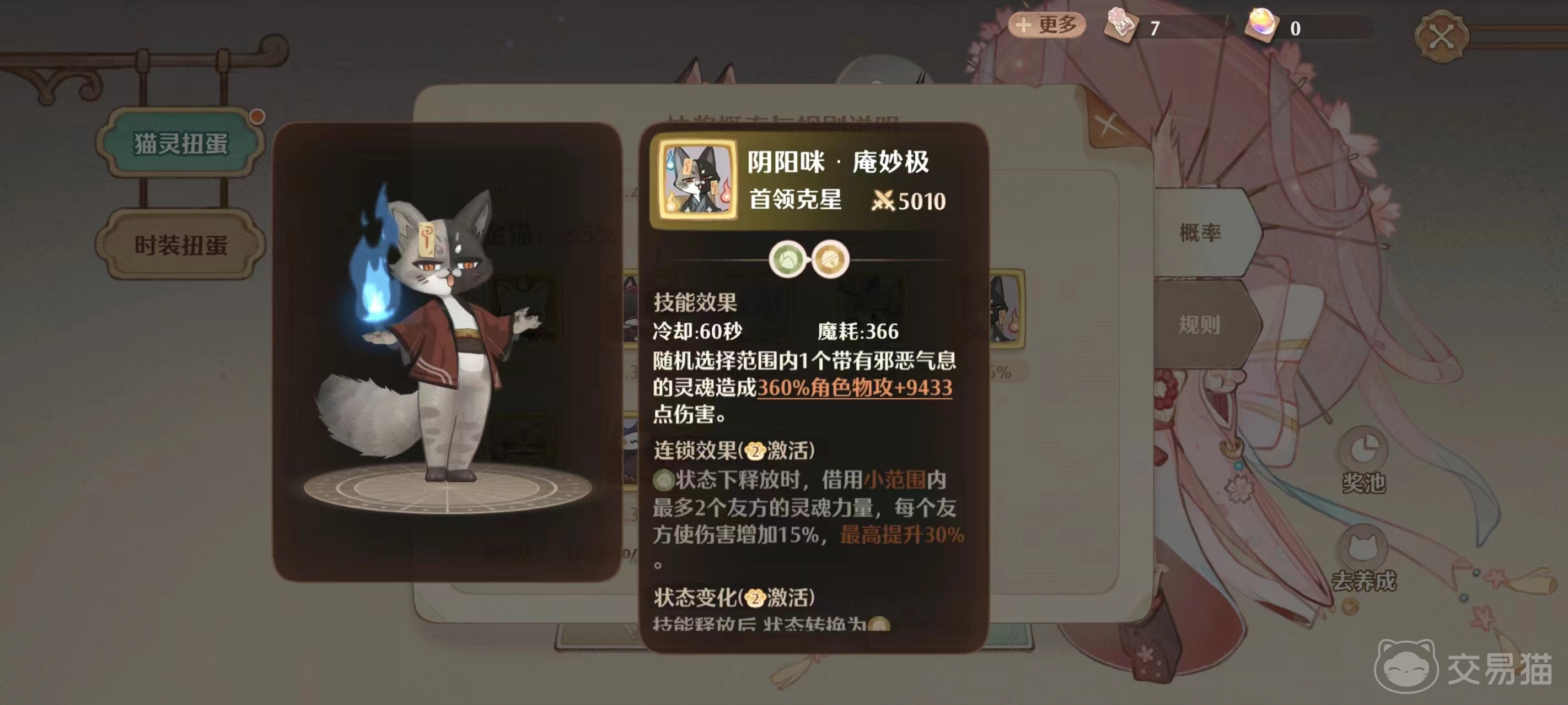 庵妙极:它也是金色猫灵中的佼佼者,外形和名字一样有着阴阳师的气息,属性以125的智慧与100的灵巧和耐力最为见长,玩法术型职业的话选择它会非常受益。