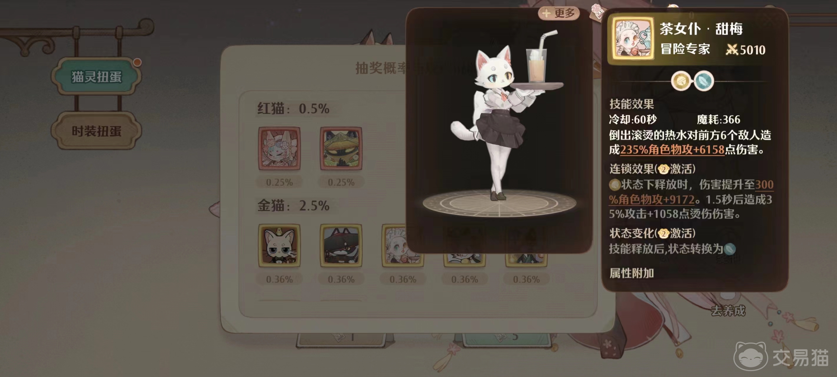 甜梅:这一猫灵相比前两位品质就要低很多,不过仍然有金色,虽然前期金猫会通过各种活动赠予,但扭蛋机里出的几率还是十分有限,而甜梅在这其中更属于稀有中的稀有,它有着5010的综合战力,附加属性中125的近身,以及100的力量和耐力都让人眼前一亮,这一属性加在你的主角身上,能让你抵抗各种类型伤害时都表现的更加游刃有余,而且因为属性偏向防御,所以无论物理系职业还是法术系职业都会很适合搭配它。
