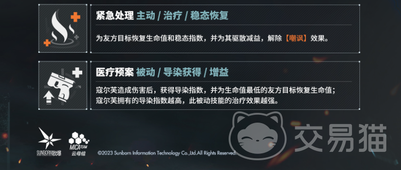 她是一名支援型的人形角色,最主要的作用就是为队友加血,并且净化队友身上的负面效果。另外该游戏里面的怪物多种多样,除了强大的攻击力之外也有一些特殊的负面效果,如果没有处理好的话,很容易导致全军阵亡。