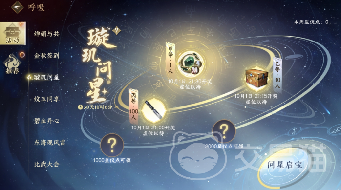 活动二:璇玑问星,这是通过参与青崖日课,从而获得星仪点。而这个游戏点可以用来兑换各种珍贵的物品,如交子、绑定纹玉、玉华染、金色内功等。此外,您还可以参与每周的璇玑抽奖,有机会赢得天赏石、稀有内功自选、鉴石神凿·绑等超级大奖。这些奖励都是非常稀有和难得的,可以让您在江湖中一飞冲天。
