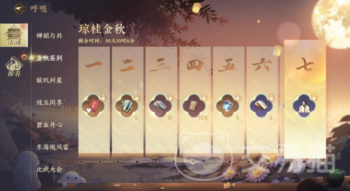 活动一:金秋签到,即简单而又实惠的活动,只要您在活动期间(9月28日-10月30日)每天登录逆水寒,就可以领取签到回报,包括外观半价礼券、内功自选、玉华染、时装瑞鹤云阳并有动作特效等。这些奖励都比较有用和有价值的,可以让您在江湖中变得更强更美。您不需要每天都签到,只要累计签到14天,就可以拿到全部的奖励。