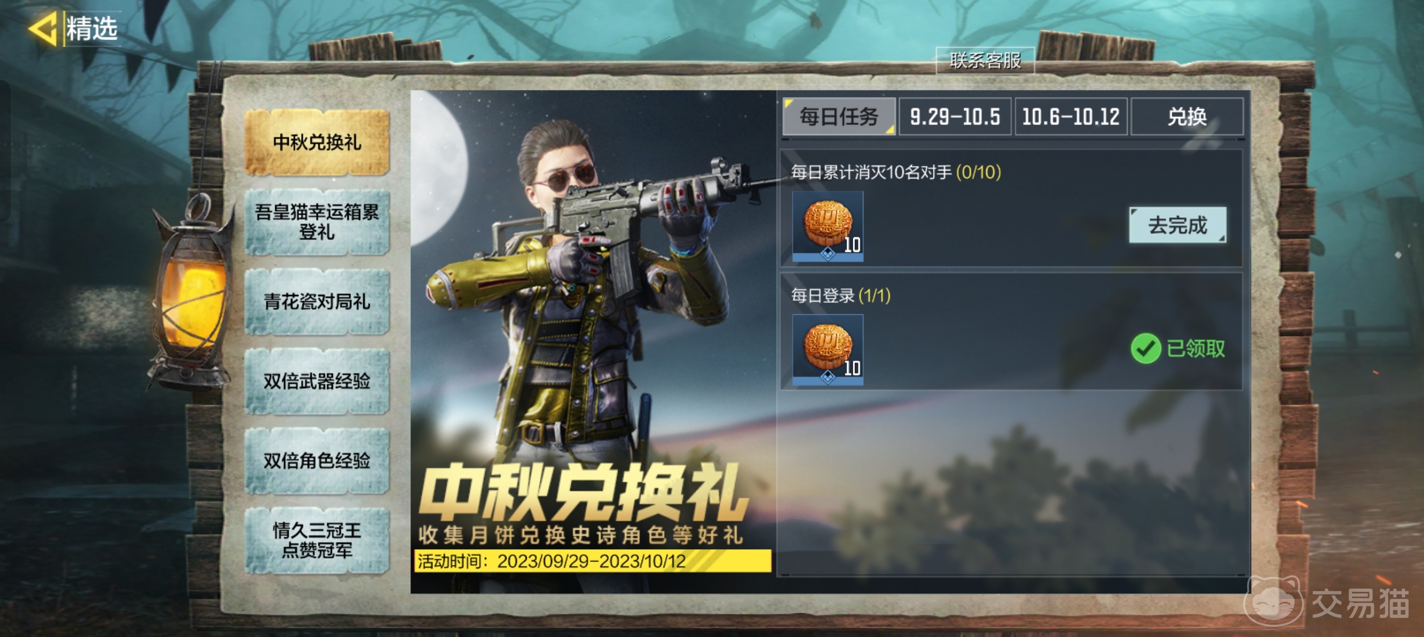 1、登录礼包。每日保持登录就能获得相应的月饼道具,获得足够的月饼道具之后可以兑换史诗级武器:FR556-灵智集中;如果能坚持签到登录的话,完成相应的任务之后能兑换皮肤:派克-战斗配置。