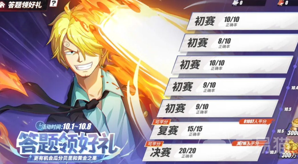 这次的答题活动奖励内容是很丰富的,将会赠送很多的黄金果以及贝利,不过对于玩家们的答题率是有要求的,想要大额的贝利奖励的话,需要至少答对15道题,而想到获得黄金果奖励的话,则需要连续答对20道题,很考验玩家们的游戏理解。