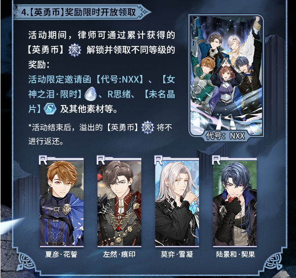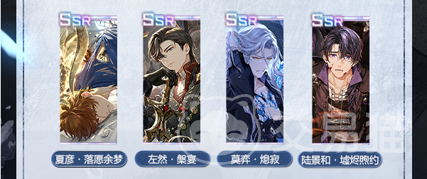 那么四个活动限定的SSR卡面都是谁呢,分别是夏彦SSR【落愿余梦】,还有左然SSR【槃宴】,第三个是莫弈SSR【熄寂】,还有陆景和SSR【墟烬煦约】,在活动结束之后他们不会进入兑换所当中,而且活动结束之后也没啥别的途径可以获得他们了。