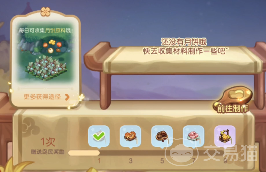 第三个活动是月饼工坊,玩家们需要去收集制作月饼的材料来进行月饼的制作,在完成月饼的制作之后,玩家们可以将做好的月饼分发给岛上的居民。系统会根据发放的次数来给玩家们一些奖励,最高发放9次的话便可以将这个活动的奖励给拿满。
