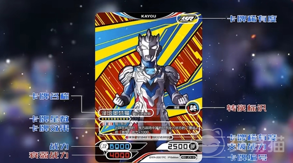 这个奥特曼的初始输出有5500,支援能力也比上面的数值要高一点,有3500,最后一个最强的UR奥特曼其实是泽塔奥特曼,在翻牌技能上面使用泽塔的话会有1张能量牌,且本回合的战力会增加1000,胜利的时候会使用2张能量牌,然后本回合此牌可不被支援角色替换,原始的输出上面有6000,而支援有1600。