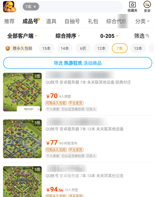 其实这款游戏的价格表也比较容易获取,大家点击上方链接下载交易猫打开之后进入到部落冲突的交易专区,在上方搜索框中键入自己大本营的等级然后就会看到有不少已经上架的对应商品及价格,之后对照战斗力、资源、排名等信息就可以了。比如7本的账号价格一般都在70-100元左右,根据布局防守胜率会有一些浮动,不过用作参考和估价是足够的了。