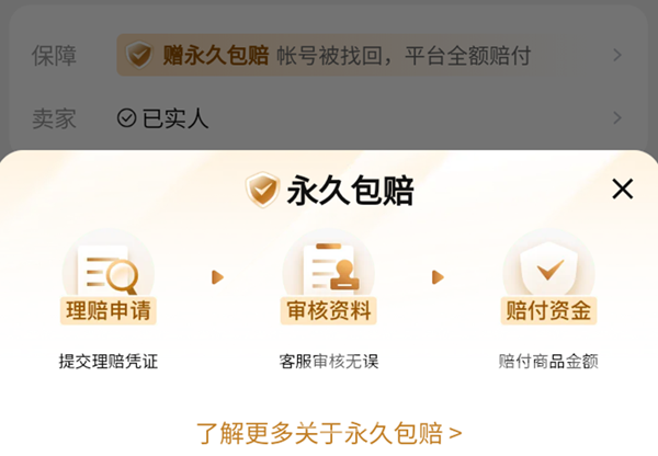另外比较推荐大家加入交易猫平台的永久包赔计划或者是购买交易安全险来获得卖号加速特权。永久包赔的意思就是在账号出现问题之后买家可以向平台申请赔付,只要我们不把账号找回基本就没有什么风险。交易安全险的作用差不多也是相同的,只不过多了一些优先展示的特权,能够让用户更轻松地看到我们上架的账号商品,在提高交易安全性能的同时让我们能够更快达到卖号的目的。