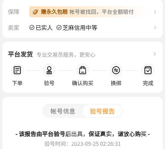 这款平台对于交易安全是比较重视的,我们在商品的详解界面中可以看到卖家的认证情况,更是可以直接看到信用等级评分,信用比较低的卖家和店铺自然是不建议大家选择了。有部分的商品还会带有官方开具的验号报告,可以保证公示内容的真实性,更是带有自动发货模式,不需要等待!在交易猫中有一些账号带有“赠永久包赔”的服务标签,购买这些账号不用顾忌被找回被封号,如果是非人为原因造成无法登录或游玩,收集凭据后向平台客服反馈一般都可以申请到赔款,免除后顾之忧。