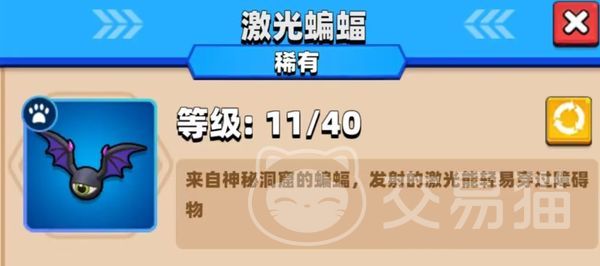 激光蝙蝠:它是一个来自神秘洞窟的一个小蝙蝠,在游戏中可以对敌人发射激光,并让佩戴者轻松穿过各种难走的障碍物。它还可以将自己的攻击力提高169,自身攻击速度增加10%,自身暴击增加20%,在它攻击敌人的期间还有50%的几率获得一个史诗技能。