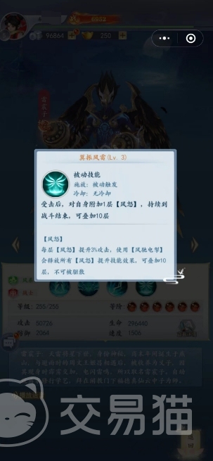 第一个被动则是在攻击的时候提升40%的输出,生命数值有20%升高的时候暴击提升15%,第二个被动是在雷震子受击后,对自身附加1层风怒效果 ,持续到战斗结束,可叠加10层,这个被动的效果其实就跟上面的第二个主动技能联合到一起了。
