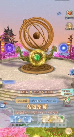 目前大家可以进行的招募方式有高级招募、基础招募以及友情招募,这三个招募方式其实都是可以召唤高星角色的,在高级招募中大家只要是十连的话就会必出一个五星英雄,这一点是高级招募的保底机制,所以概率还是比较高的,不过消耗的道具不算好获取。