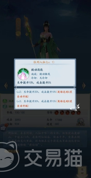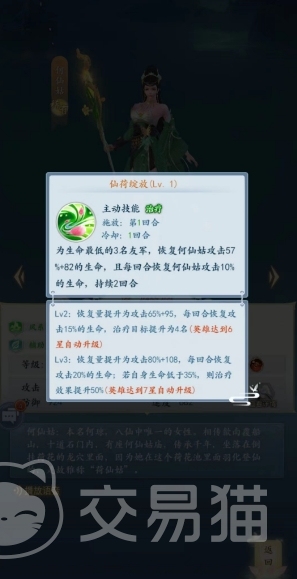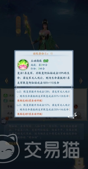 第二个主动技能是羽化登仙,这个技能也是一个带有复活的技能,其实这款游戏中基本上好一点的奶妈都是带有复活的,使用这个技能的时候会先复活1名友军,然后恢复何仙姑自己攻击109%的生命,要是这个技能释放的时候友军无人死亡的话,则为生命最低的1名友军恢复何仙姑攻击185%+110生命。