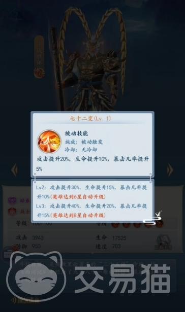 第一个被动是七十二变,可以带来攻击加20%之后血量上面也提升10%,最后是暴击产生的概率提升5%的效果,这个被动的效果是比较一般的,但是另外一个被动的效果就可以看搭配一技能使用,处于棒打妖怪状态影响中的敌人死亡后,为全体友军恢复斗战胜佛攻击80%的生命,这个技能可以当做恢复型的技能使用。