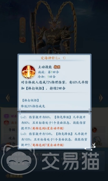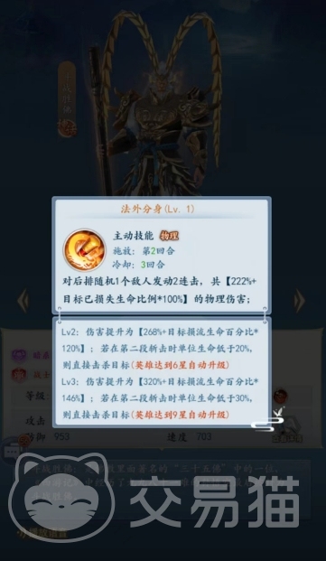法外分身这个主动技能则是带来的对后排随机1个敌人发动2连击,共222%加上目标已损失生命比例有100%的物理伤害,虽然是一个物理型的伤害,但是伤害数值真的是很高了,也符合了斗战圣佛暗系战士的这个身份,后期升星之后还会自动升级哦。