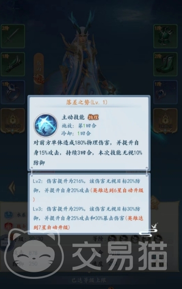 落差之势是敖丙的第一个主动技能,使用的时候可以带来对前方单体敌人造成180%物理伤害,并提升敖丙的15%攻击能力,持续3回合的提升时间可以做好对战开局准备,而且在使用的时候本次技能无视10%防御效果,就算对面有趣强大的前排也不用害怕了。