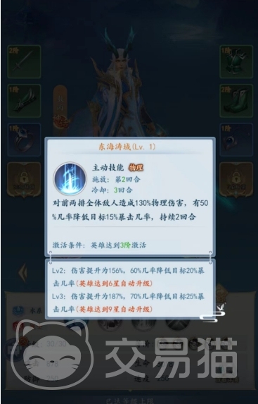 东海涛域是敖丙的第二个主动技能,使用的时候是对前两排全体敌人造成130%物理伤害,有一半的几率在接下来的两个回合中都降低该目标15%暴击几率,但是这个技能属于是一个升阶的技能,所以是需要角色升级到3阶的时候才可以使用。
