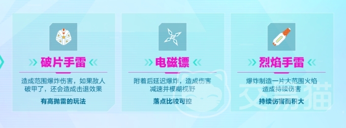 首先就是在战斗上面有一定效果的投掷物,这类投掷物其实是可以给大家带来战斗加成的,这里有三种道具,两个手雷,破片手雷是恶意带来普通爆炸伤害的,而烈焰手雷则是有火焰持续伤害的,电磁镖是第三种可以带来延迟爆炸伤害,并且影响视线的一个投掷道具。